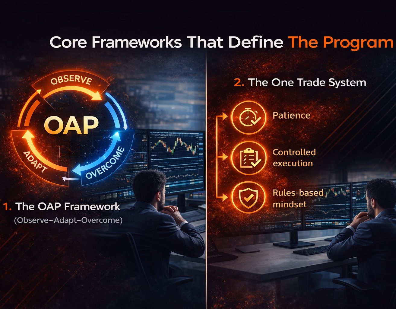 Designed to create uniformity in decision-making, this framework trains traders to read evolving market conditions, adjust dynamically, and execute with clarity . It emphasizes focus, consistency, flexibility during losses, and structured problem-solving.